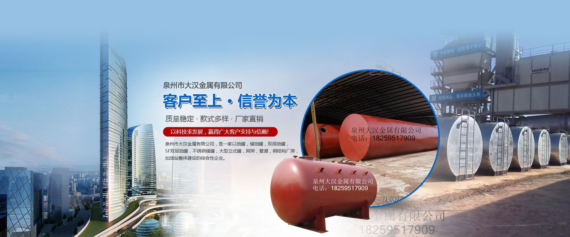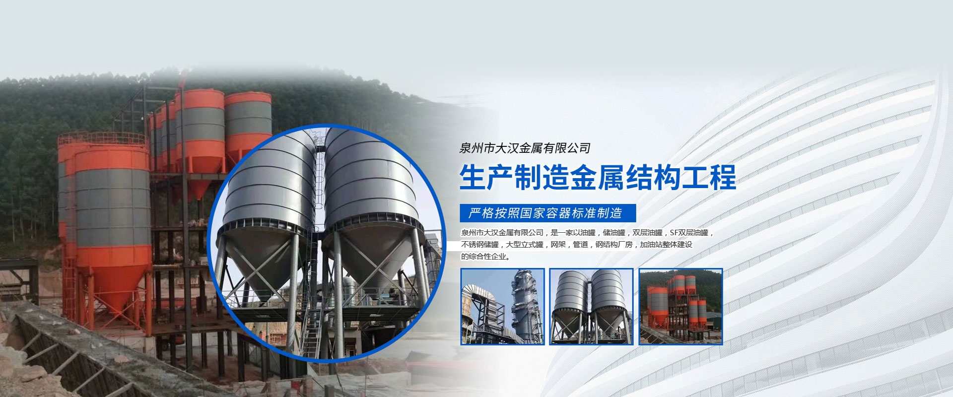 泉州市大漢金屬有限公司,是一家以油罐、儲油罐、雙層油罐、SF雙層油罐、不銹鋼儲罐、大型立式罐、網(wǎng)架、管道、鋼結(jié)構(gòu)廠房、加油站整體建設(shè)的綜合性企業(yè)。本公司以技術(shù)人員、施工經(jīng)驗豐富的工程隊、自動化設(shè)備、擁有鋼結(jié)構(gòu)建筑、螺栓球網(wǎng)架設(shè)計安裝技術(shù)力量,嚴格按照國家容器標準制造,是一家產(chǎn)品開發(fā)并生產(chǎn)各種壓力容器和制造金屬結(jié)構(gòu)工程,化工石油工程安裝的大型企業(yè)。近多年來,以質(zhì)量穩(wěn)定、客戶至上、信譽為本,以科技求發(fā)展,贏得廣大客戶支持與信賴。